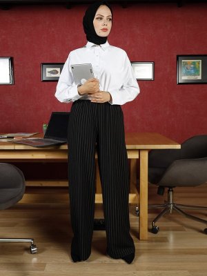 Ceylan Otantik Siyah Çizgili Bol Paça Pantolon