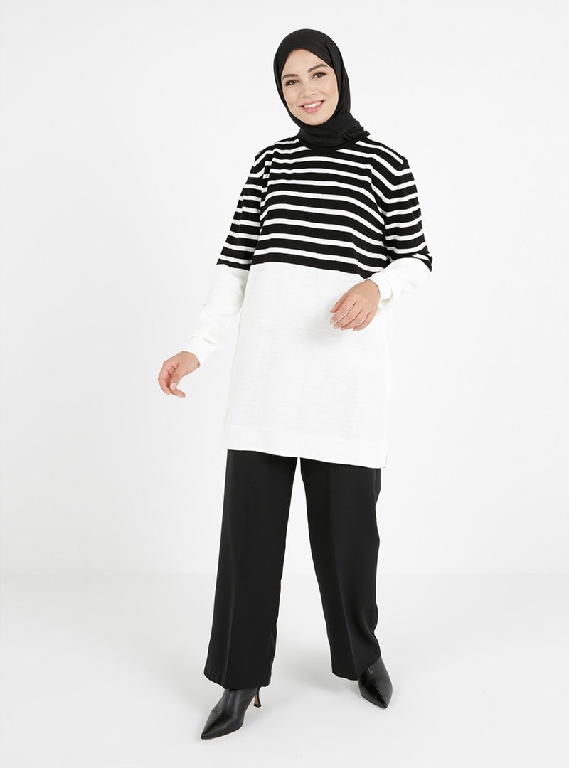 Tavin Siyah Ekru Bisiklet Yaka Omuzları Çizgi Detaylı Color Blok Triko Tunik