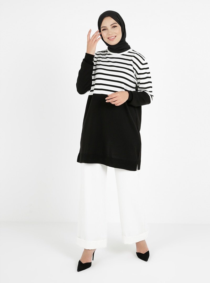 Tavin Siyah Ekru Bisiklet Yaka Omuzları Çizgi Detaylı Color Blok Triko Tunik