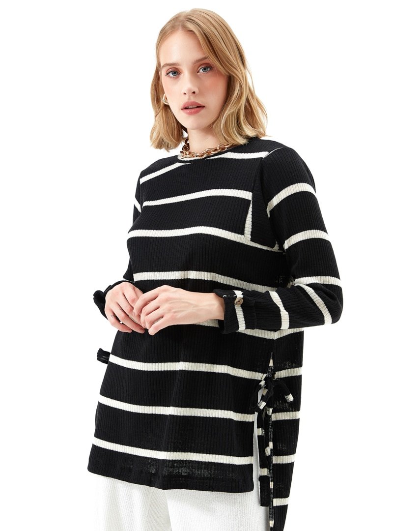 Muni Muni Siyah Yandan Bağcıklı Çizgili Tunik