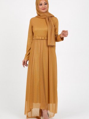 TESETTURİUM Hardal Pileli Simli Şifon Abiye Elbise