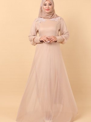 TESETTURİUM Vizon Simi Şifon Omuz Dantel İşli Abiye Elbise