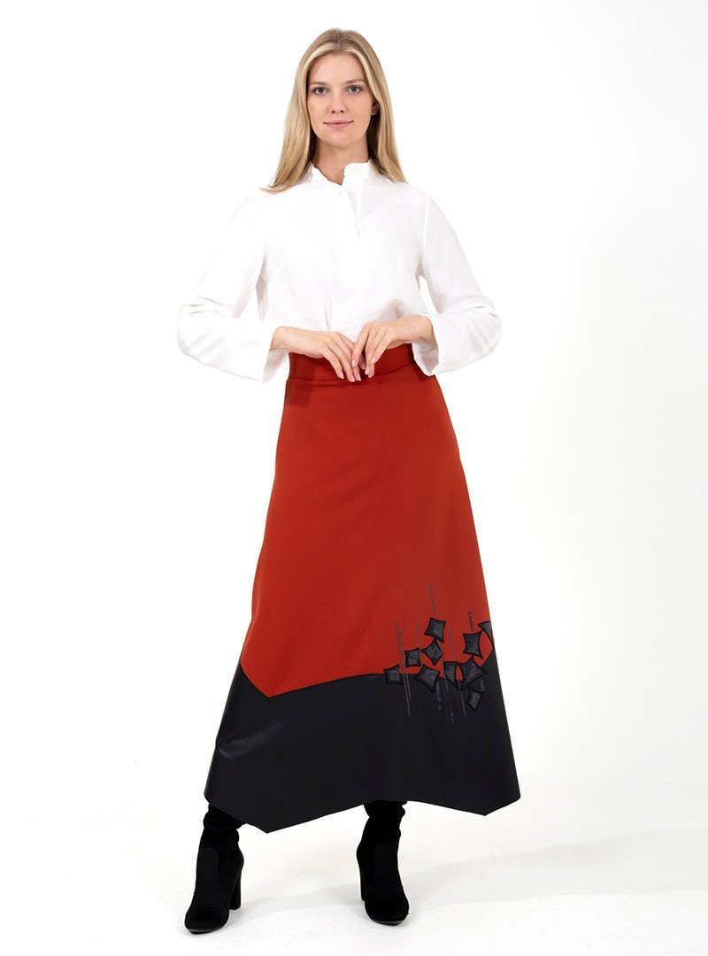 ONX10 Kiremit Nakışlı Deri Detaylı Etek