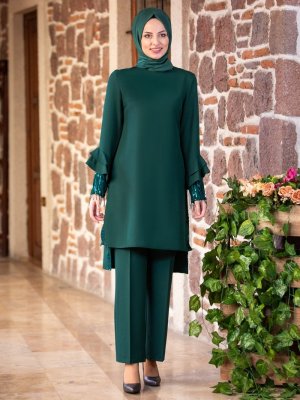 Fashion Showcase Design Zümrüt Volan Kol Payet Detay Tunik & Pantolon İkili Abiye Takım