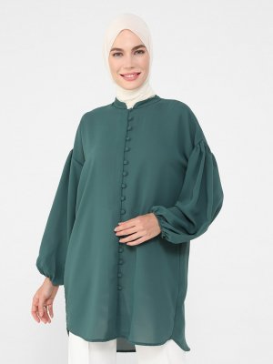 Refka Koyu Zümrüt İpek Tuşeli Balon Kollu Tunik