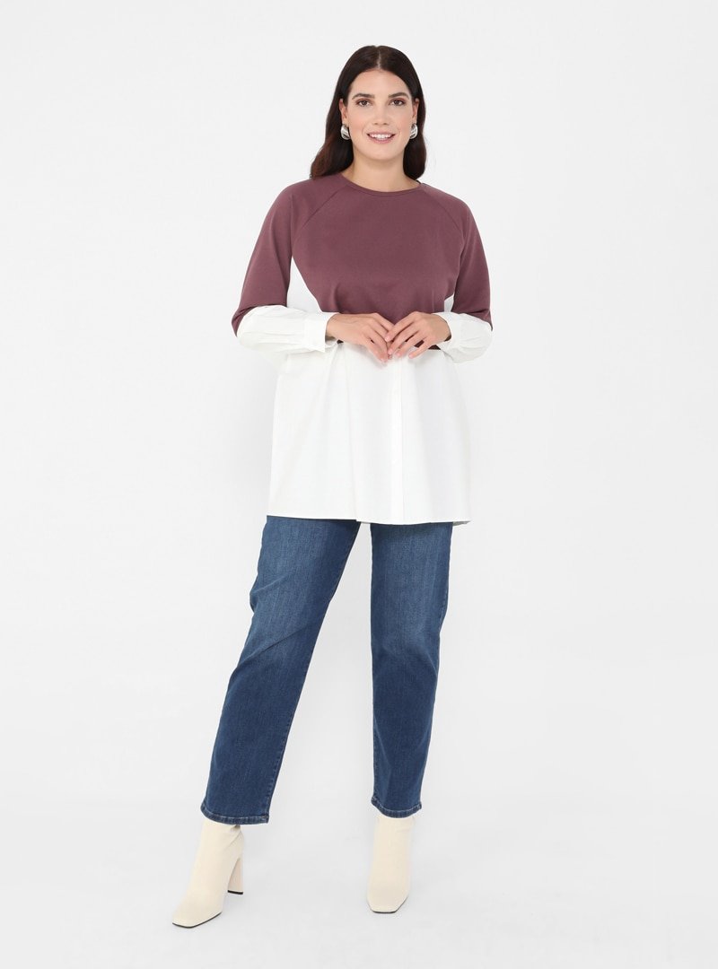 Alia Mistik Mor Ekru Büyük Beden Düğme Detaylı Garnili Tunik
