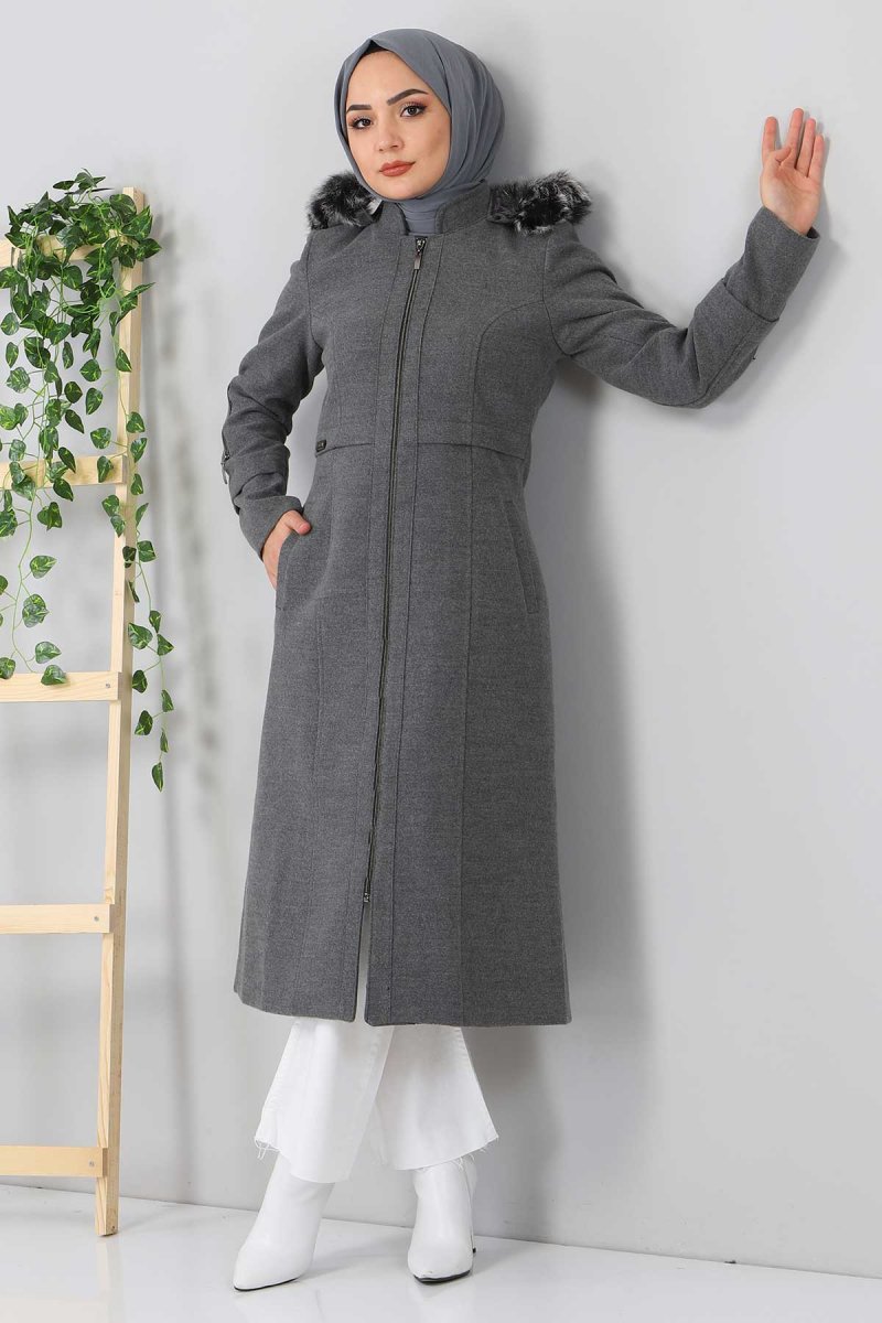 Tesettür Dünyası Gri Kolları Süs Fermuarlı Kaşe Kaban