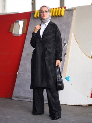 Ceylan Otantik Siyah Çizgili Ceket & Pantolon İkili Takım