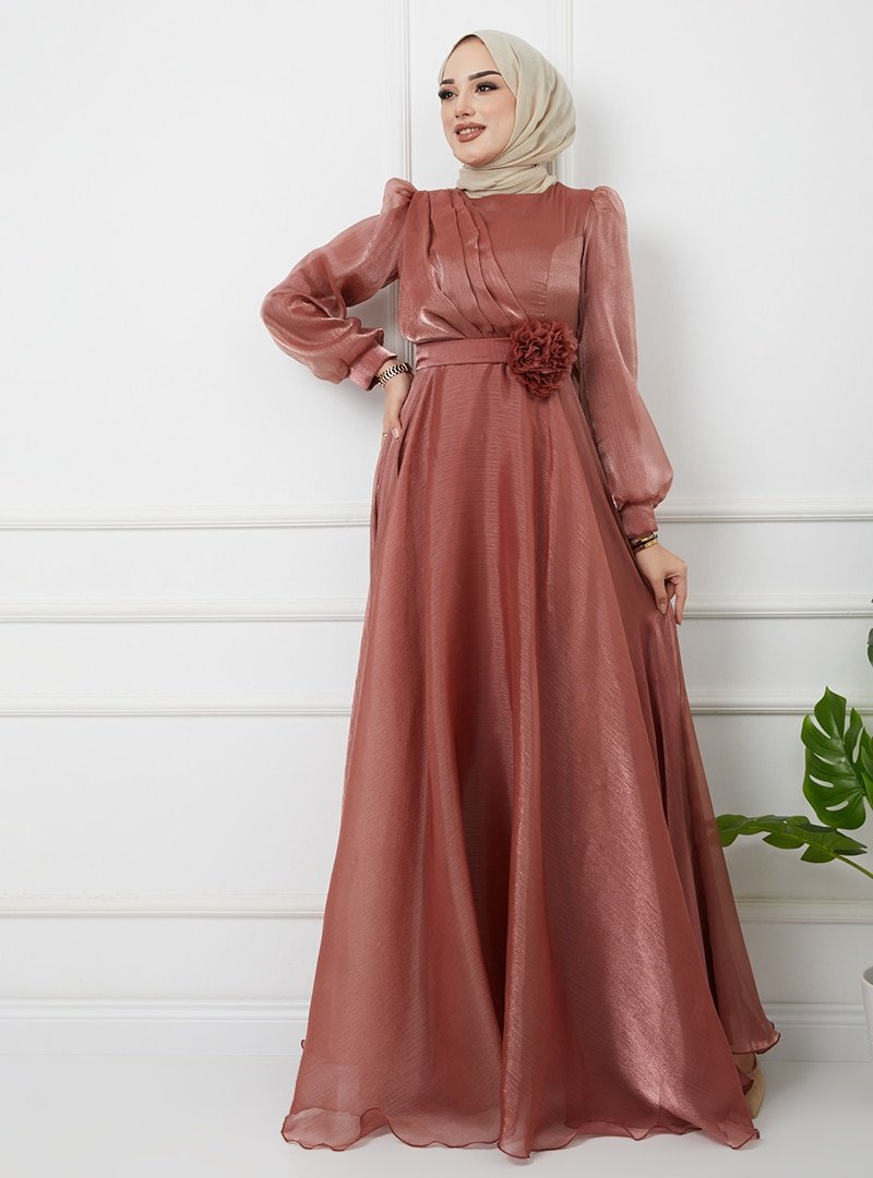 Olcay Bakır Kemeri Çiçek Detaylı Simli Abiye Elbise