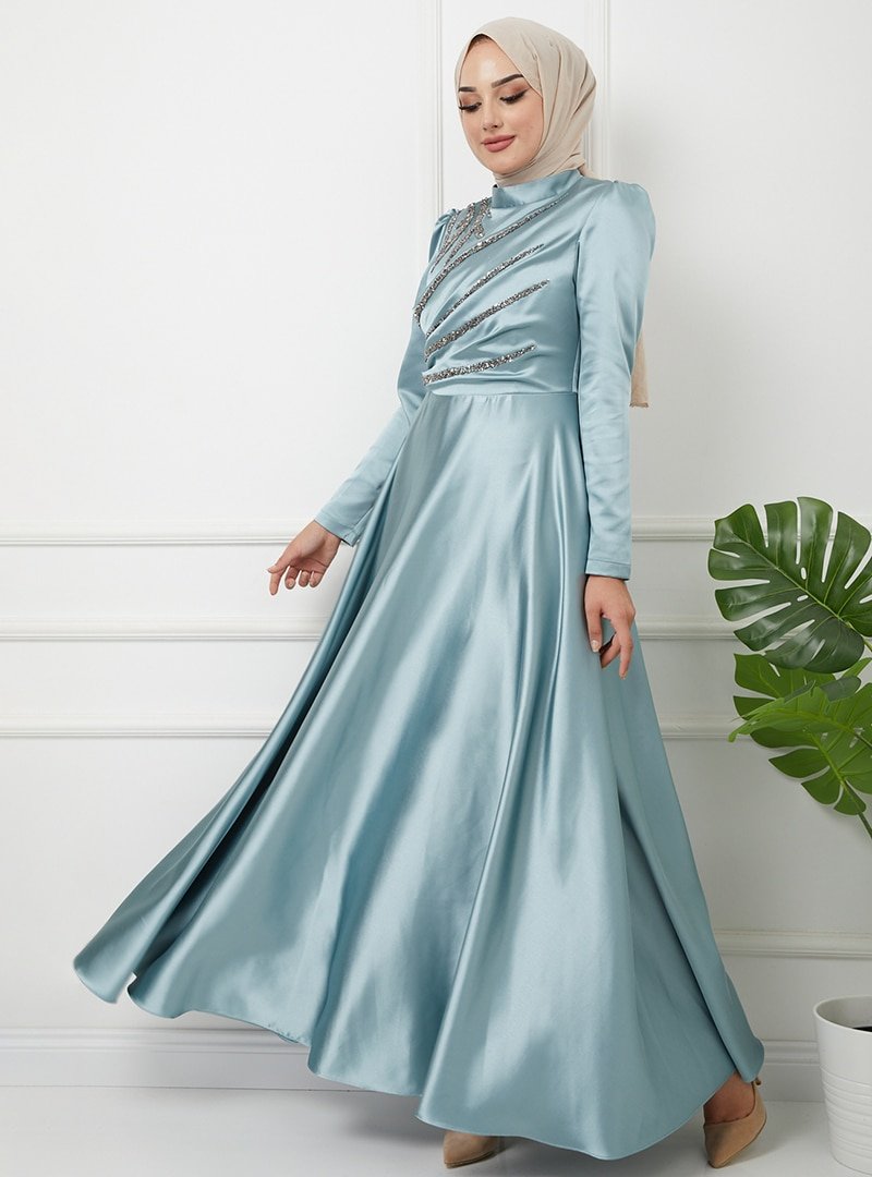 Olcay Mint Önü Volan Ve Taş Detaylı Saten Abiye Elbise