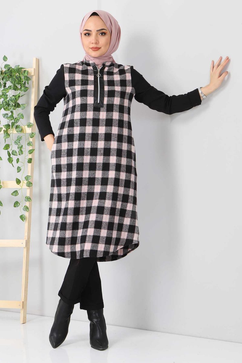 Tesettür Dünyası Pembe Fermuar Detaylı Ekose Tunik