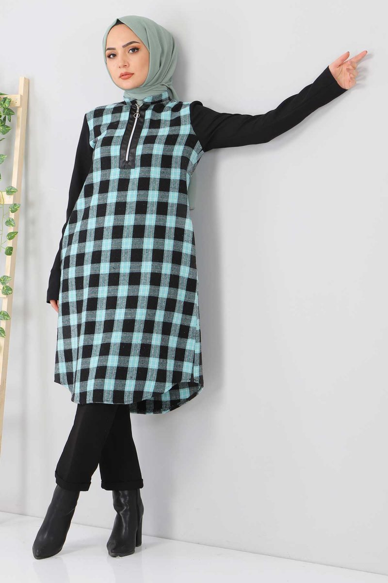 Tesettür Dünyası Mint Yeşili Fermuar Detaylı Ekose Tunik