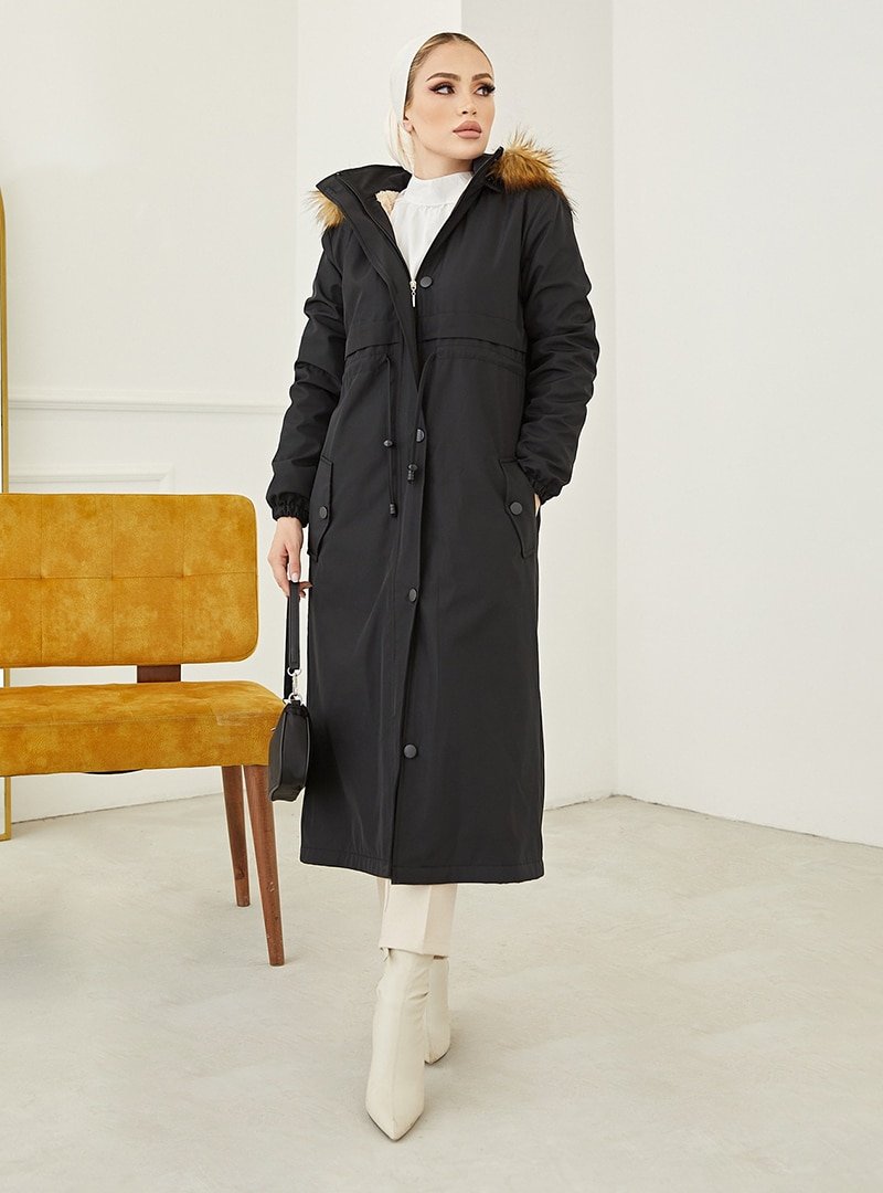 MODAEFA Siyah Kapüşonlu İçi Kürklü Kaban