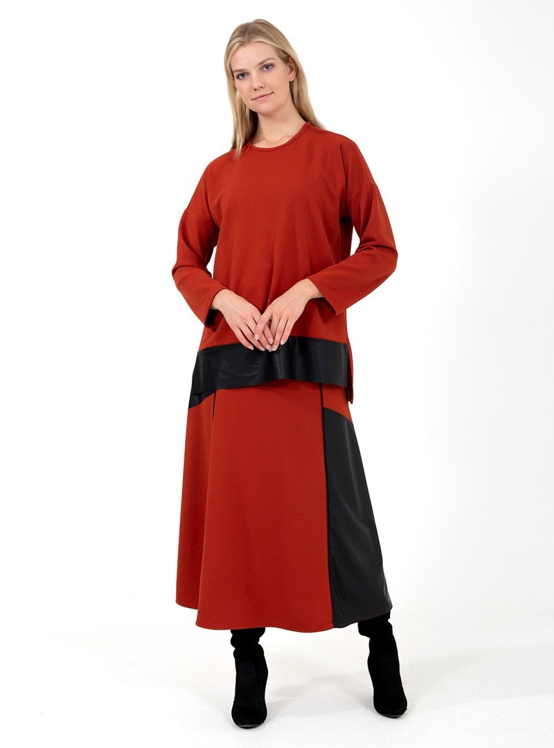ONX10 Kiremit Deri Garnili Tunik & Etek İkili Takım