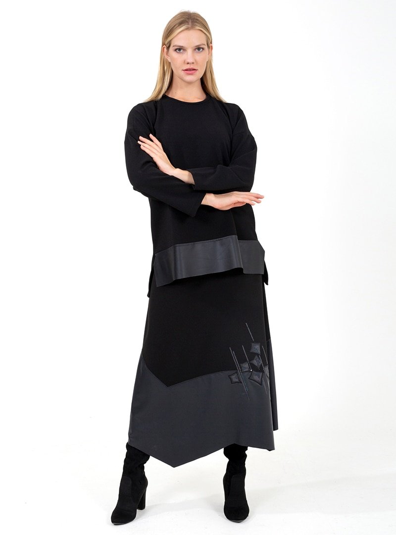 ONX10 Siyah Nakış Detaylı Deri Garnili Tunik & Etek İkili Takım