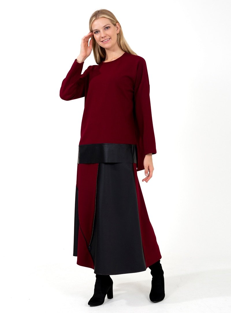 ONX10 Bordo Fermuar Detaylı Deri Garnili Tunik & Etek İkili Takım