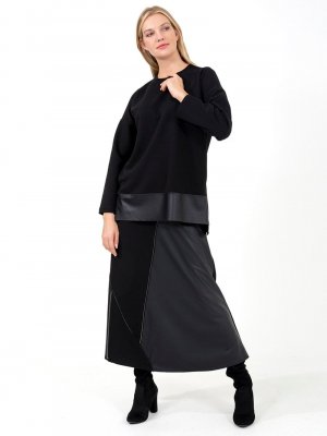 ONX10 Siyah Fermuar Detaylı Deri Garnili Tunik & Etek İkili Takım
