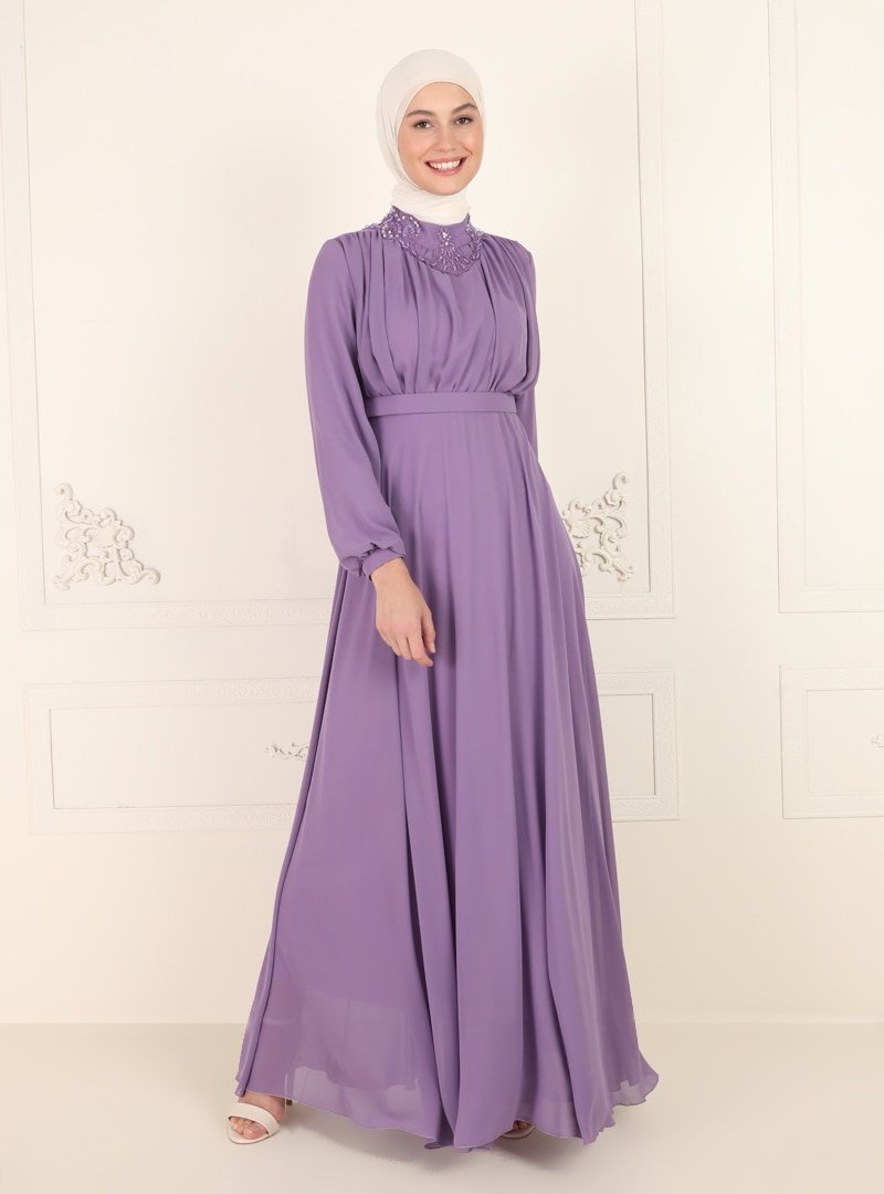Amine Hüma Lila Yakası Taş Detaylı Abiye Elbise