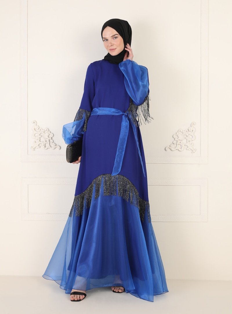 Ziwoman Saks Mavisi Püskül Detaylı Abiye Elbise