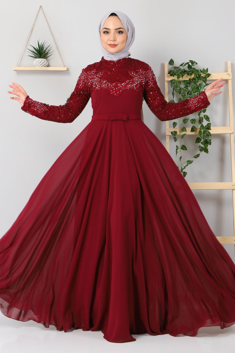 MISSVALLE Bordo İncili Abiye Elbise