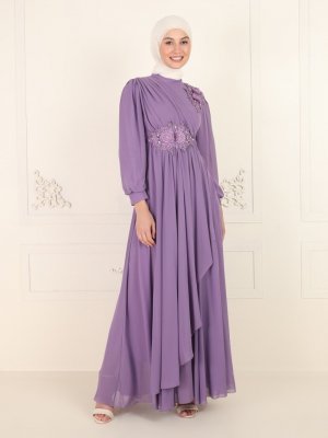 Amine Hüma Lila Boncuk Detaylı Abiye Elbise
