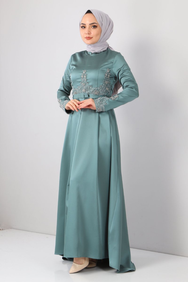 MISSVALLE Mint Dantelli İncili Saten Abiye Elbise