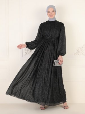 MEKSİLA Siyah Simli Tül Detaylı Abiye Elbise