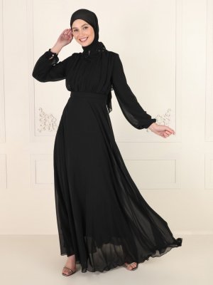 Amine Hüma Siyah Yakası Taş Detaylı Abiye Elbise
