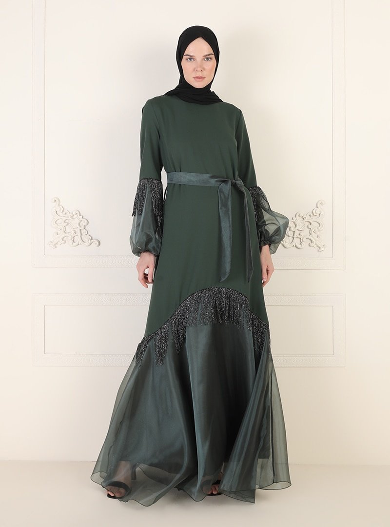 Ziwoman Yeşil Püskül Detaylı Abiye Elbise