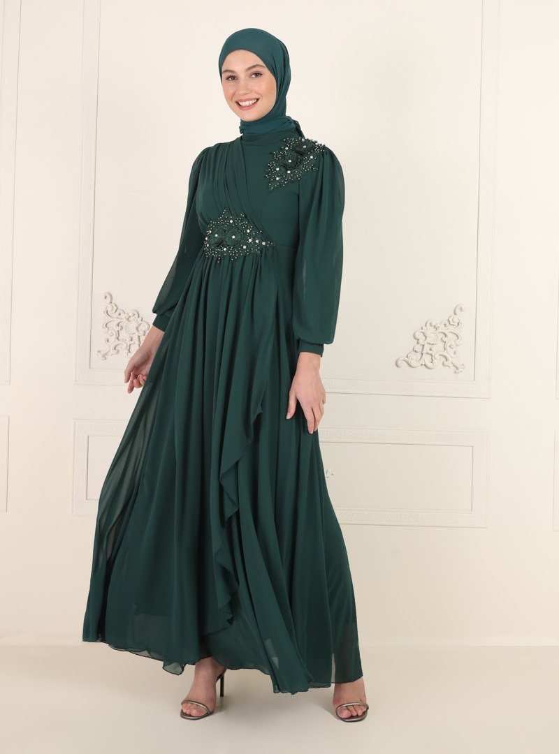 Amine Hüma Zümrüt Boncuk Detaylı Abiye Elbise