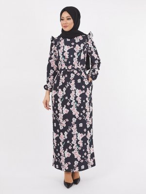 TESETTURİUM Siyah Dijital Baskılı Krep Elbise
