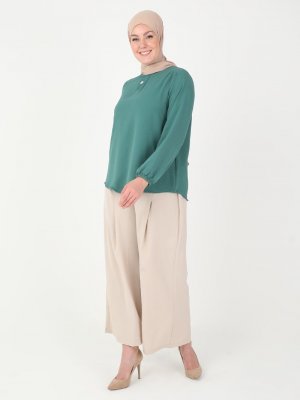 ENSANUR MODA Koyu Yeşil Kol Uçları Lastik Detaylı Tunik
