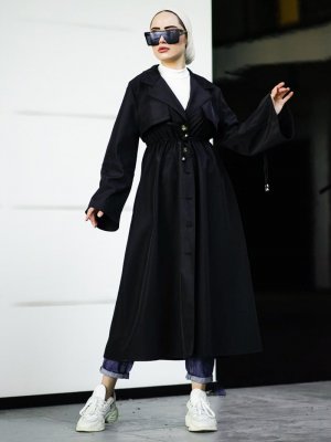 Topless Siyah Kolları İpli Trençkot