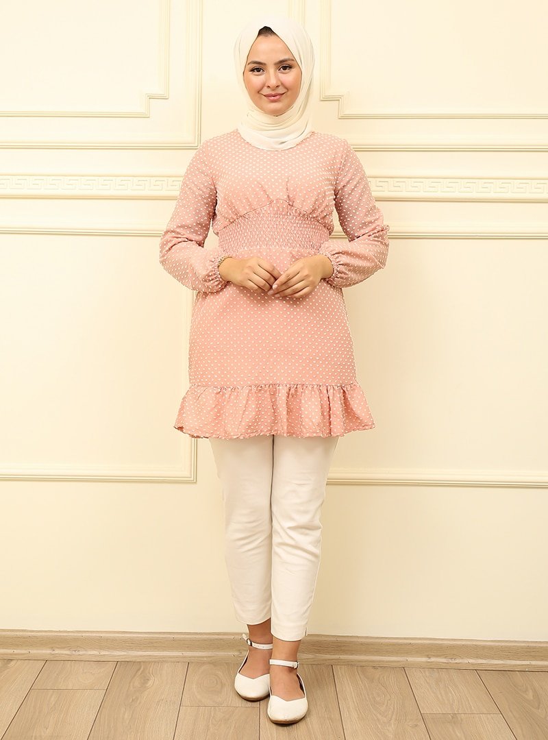 Moda Dua Pudra Ponponlu Beli Büzgülü Tunik