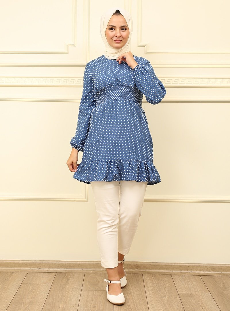 Moda Dua İndigo Ponponlu Beli Büzgülü Tunik