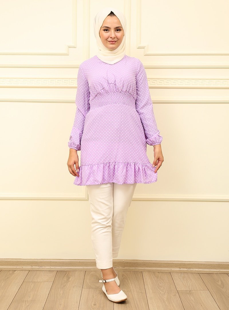Moda Dua Lila Ponponlu Beli Büzgülü Tunik
