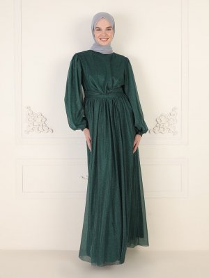 MEKSİLA Zümrüt Yeşili Simli Tül Detaylı Abiye Elbise