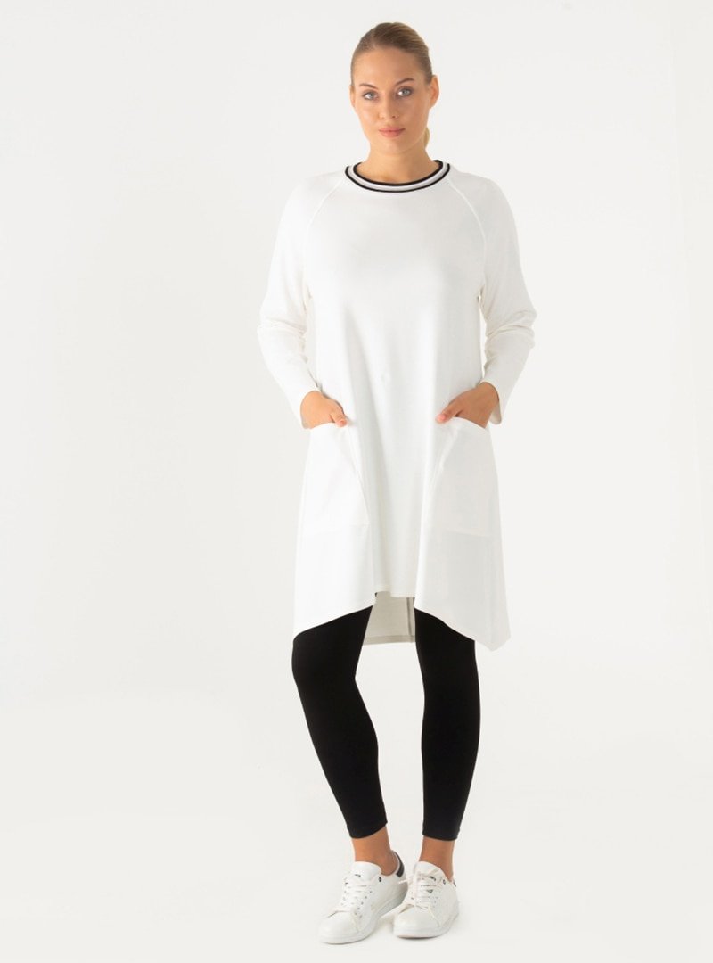 FLOWİST PLUS SİZE Beyaz Büyük Beden Ribana Detaylı Reglan Kollu Tunik