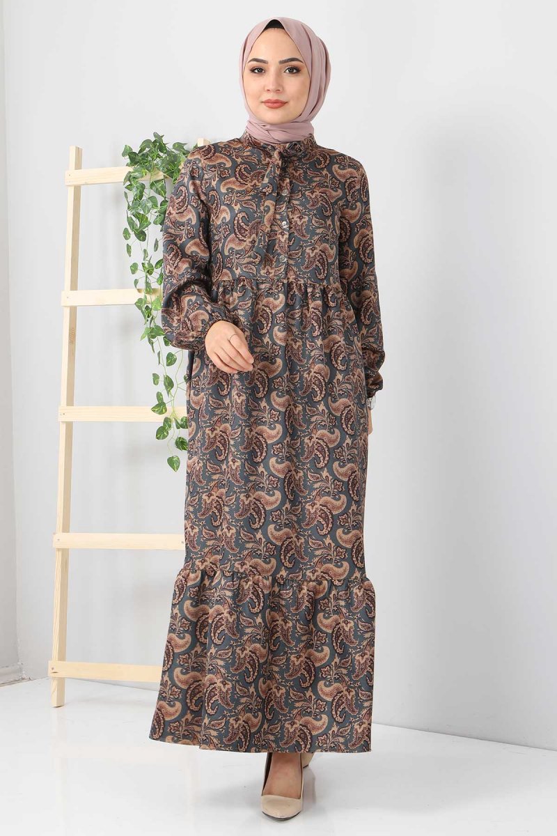 Tesettür Dünyası Petrol Şal Desenli Elbise