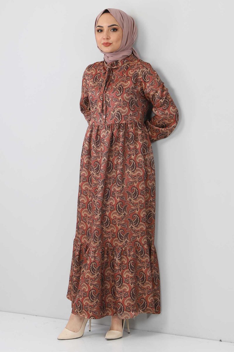 Tesettür Dünyası Kahverengi Şal Desenli Elbise