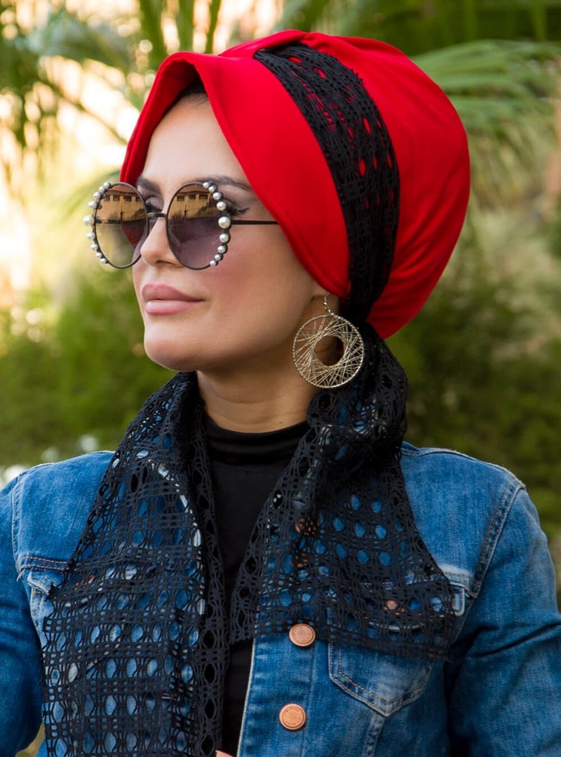AİŞE TESETTÜR Kırmızı Siyah Dantel Şapkalı Bone