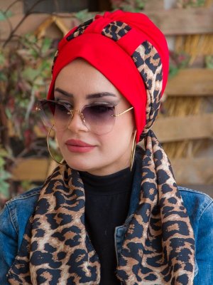 AİŞE TESETTÜR Kırmızı Leopar Fularlı Bone