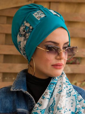 AİŞE TESETTÜR Petrol Mavi Beyaz Fularlı Bone