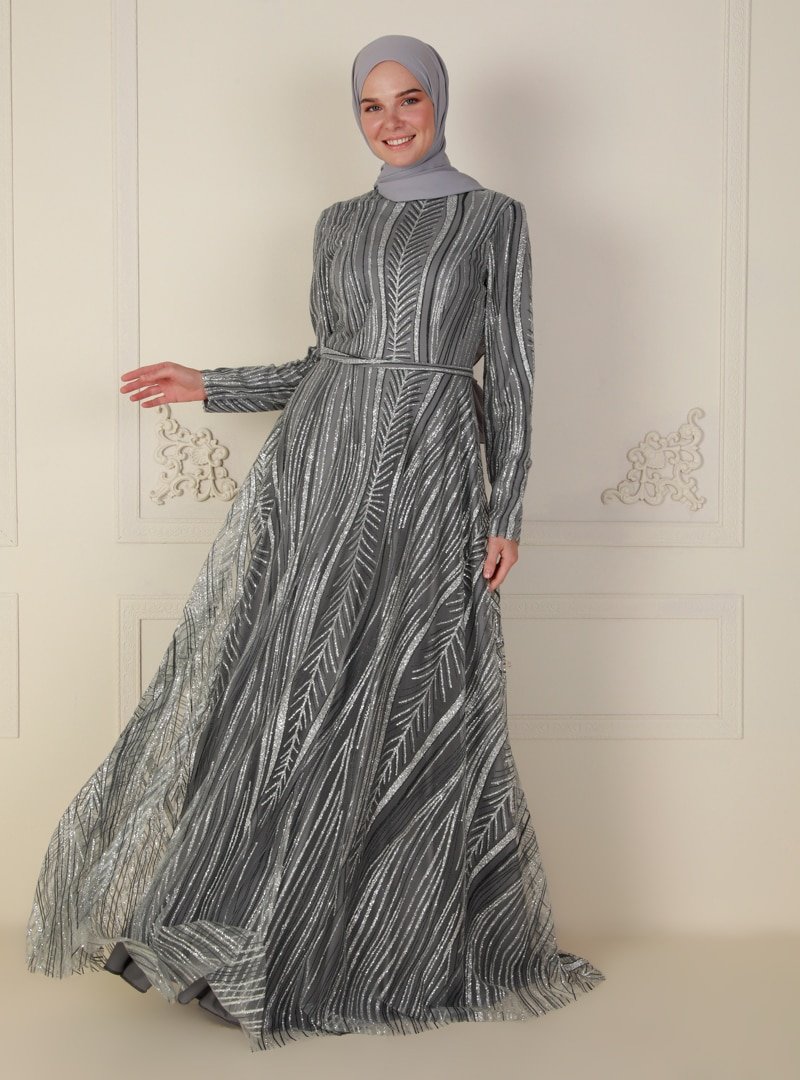 Mileny Gri Simli Uzun Abiye Elbise