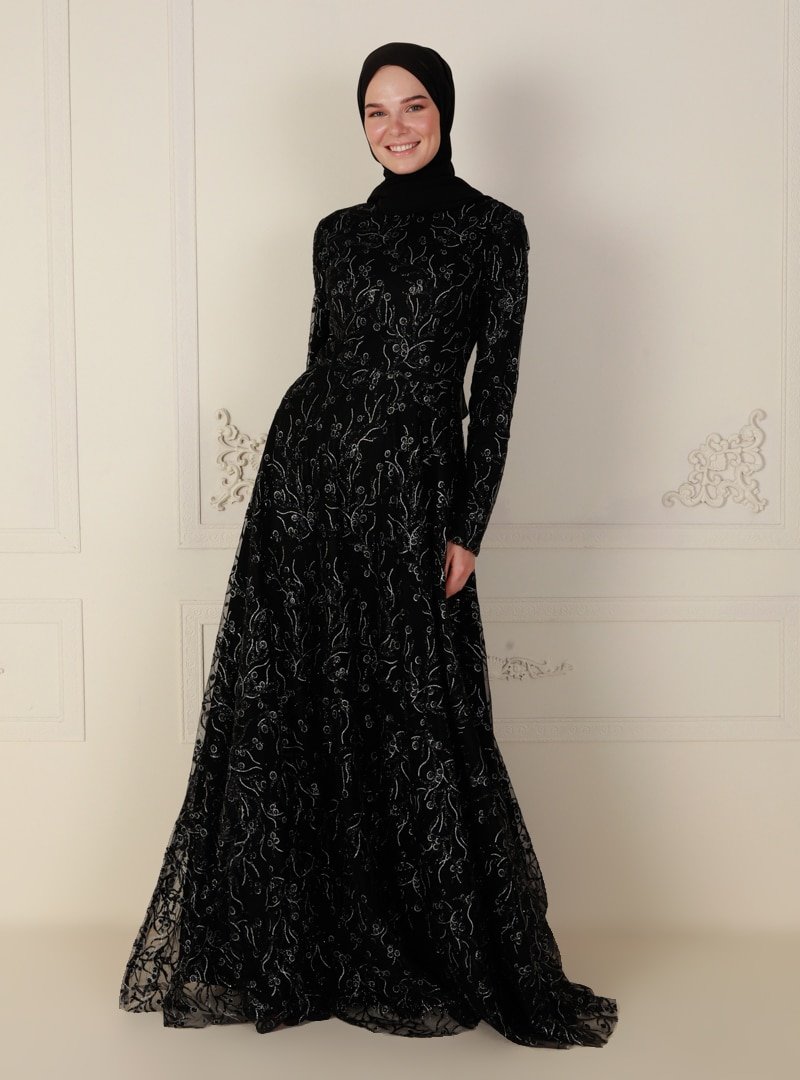 Mileny Siyah Simli Uzun Kol Abiye Elbise