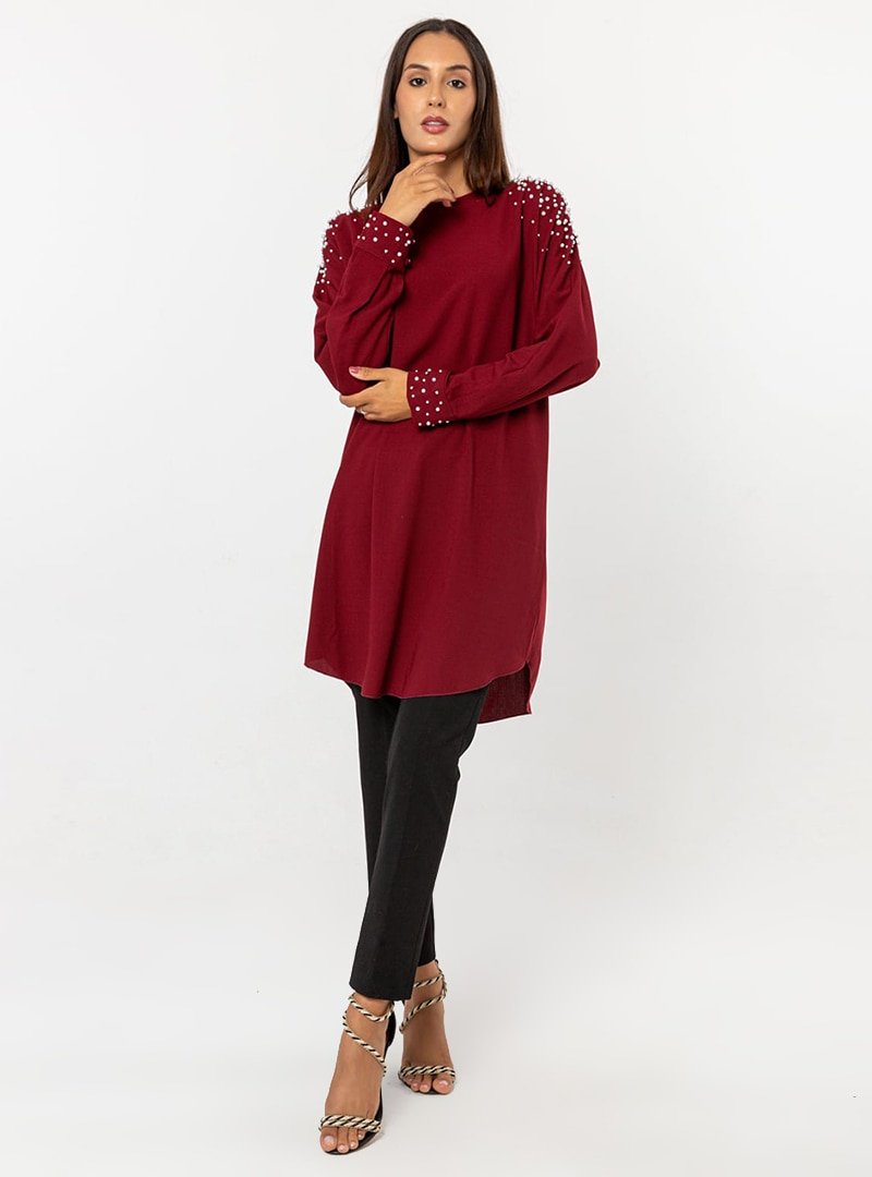 Nurkombin Bordo İncili Yarasa Kol Tunik
