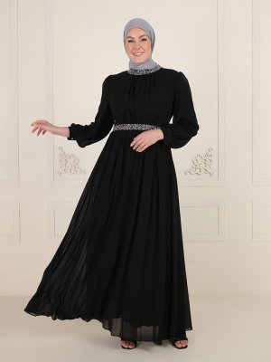 MODAYSA Siyah Yaka Ve Beli Taşlı Abiye Elbise