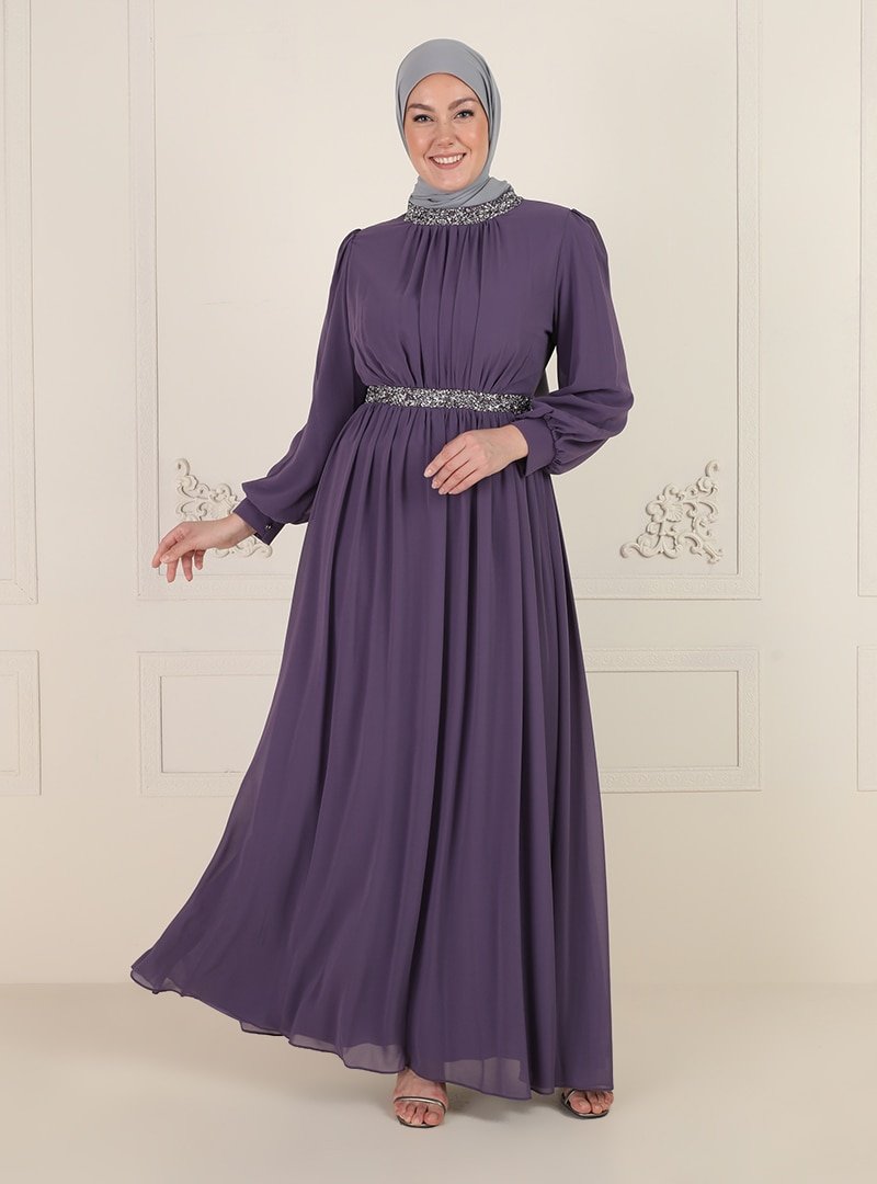 MODAYSA Koyu Lila Yaka Ve Beli Taşlı Abiye Elbise
