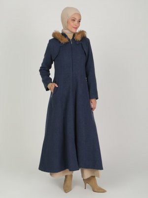 BÜRÜN İndigo Kapüşonu Kürk Detaylı Kaban