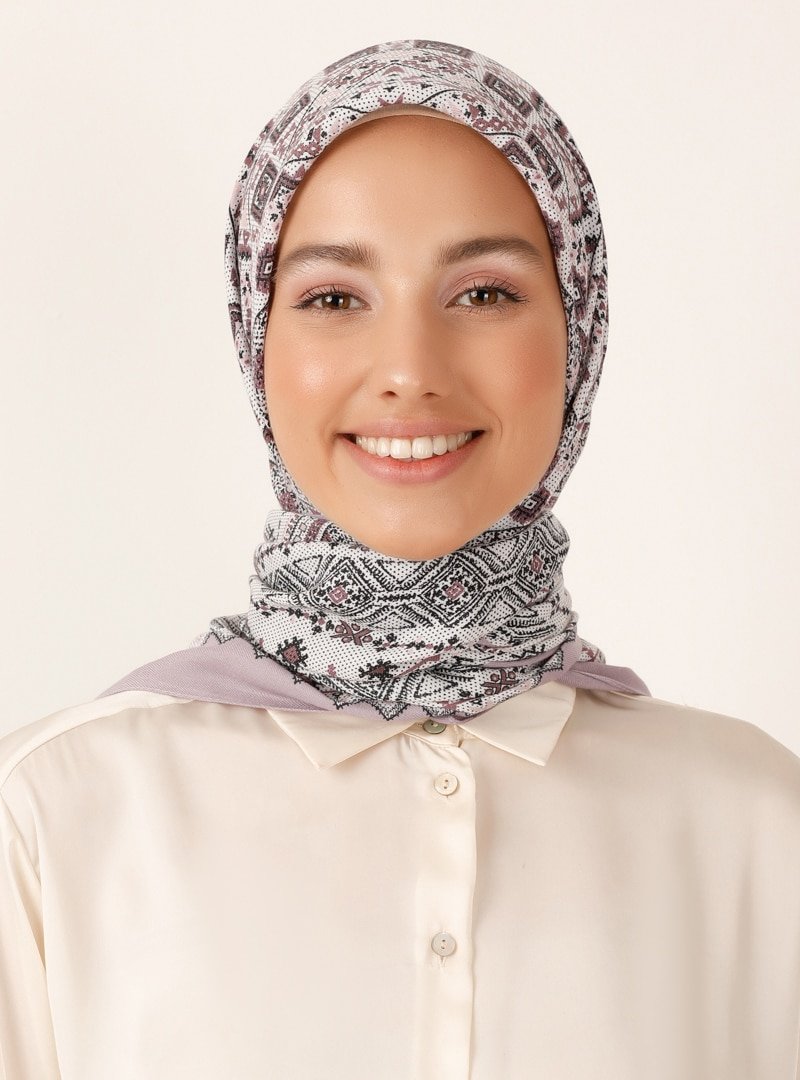 Miray Koyu Lila Kırık Beyaz Otantik Desen Cashmere Kışlık Eşarp